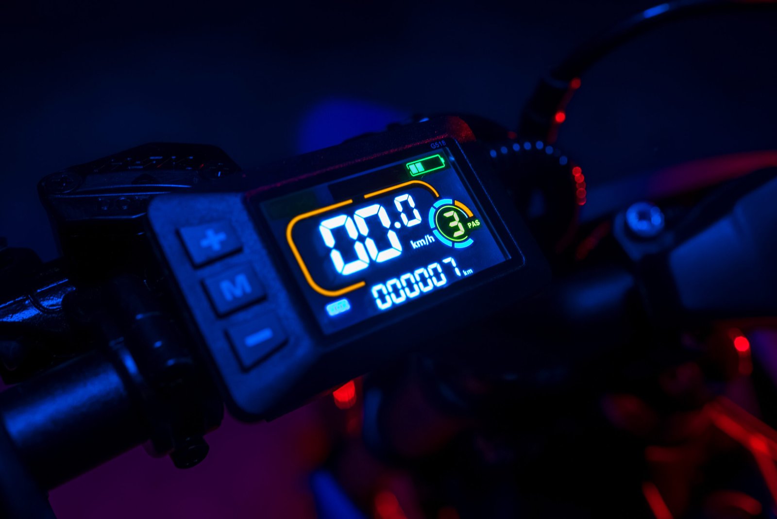 Panel LCD multifunción con indicador de velocidad, batería y modos de conducción.
